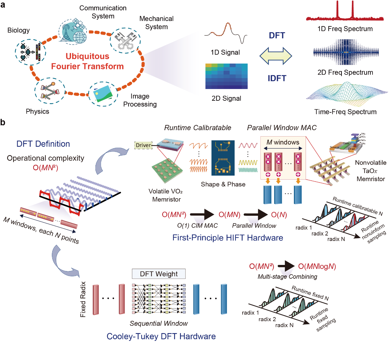 在此背景下,日韩a片 杨玉超教授、人工智能研究院陶耀宇研究员团队科研团队在国际上首次实现了基于忆阻器异质集成架构的第一性原理傅里叶变换系统(Hetero-Integrated Fourier Transform, HIFT),提出了一种全新的、融合易失型与非易失型忆阻器的高通量频谱计算体系结构。该研究从物理层面重新定义了傅里叶变换的计算机制,实现了在同一硬件平台上对任意基数、均匀或非均匀离散傅里叶变换的统一支持,标志着傅里叶变换硬件体系从算法驱动走向材料与物理原理驱动的重大跨越。相关成果以题为《A first-principle hetero-integrated Fourier transform system based on memristors》的论文,发表于国际顶级期刊《自然·电子》(Nature Electronics)。