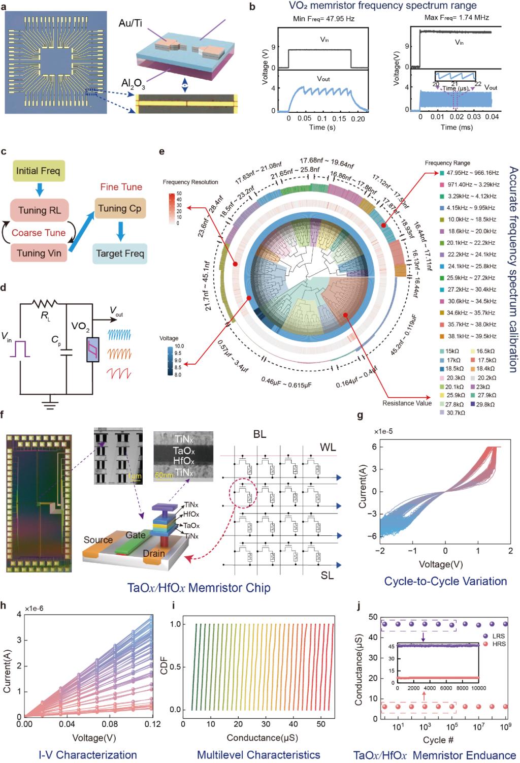 该系统的核心创新在于将易失型氧化钒(VO₂)忆阻器与非易失型氧化钽/铪(TaOx/HfOx)忆阻器进行异质集成,充分发挥两类器件在频率生成与存内计算方面的互补优势。