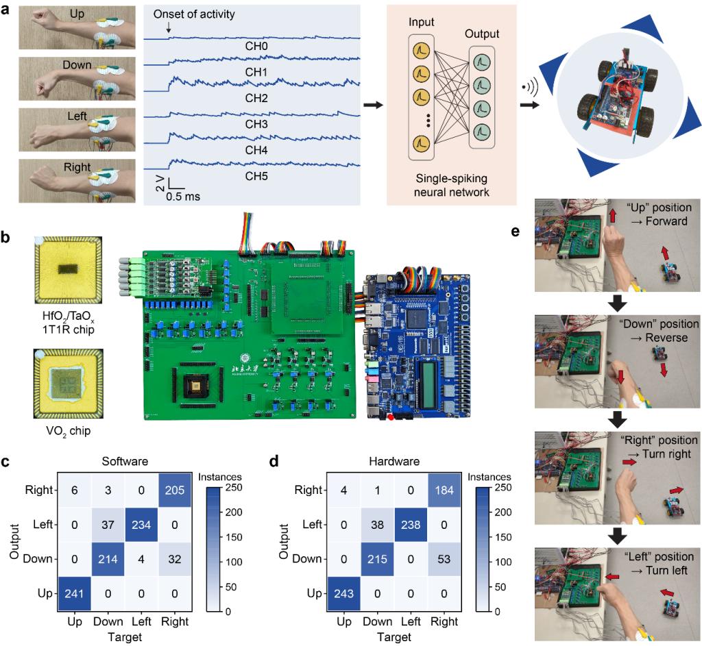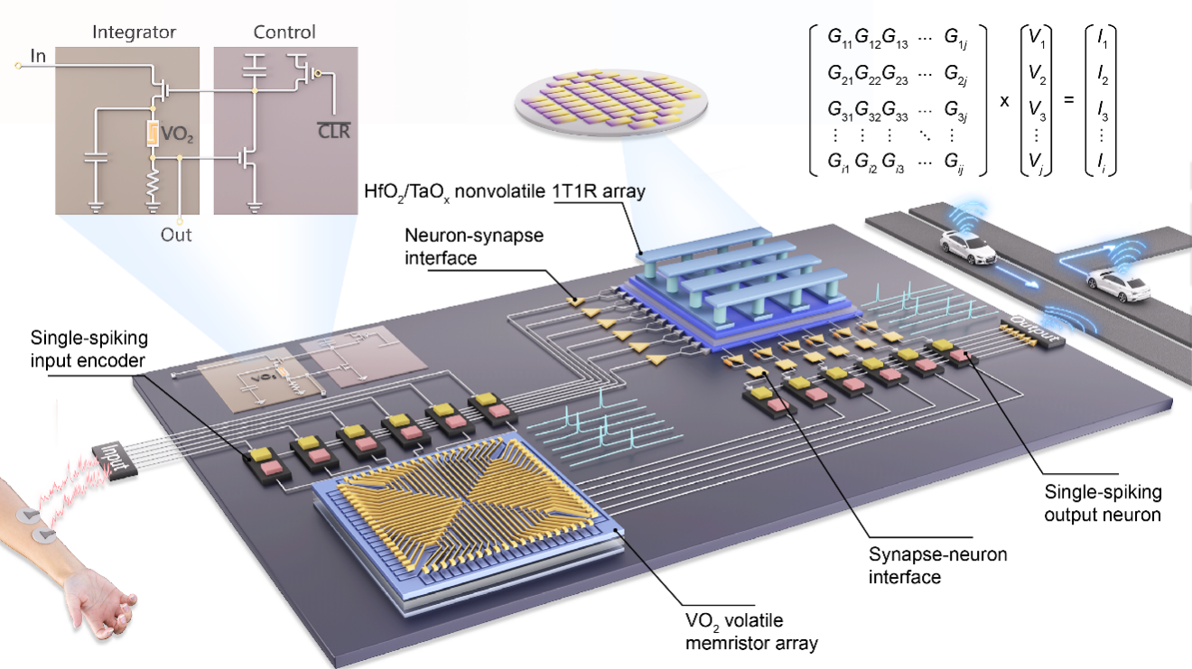 相关成果以“An end-to-end memristive hardware system based on single-spike coding for human-machine interfaces”为题,发表在《自然-电子》(Nature Electronics)上。日韩a片 2021级博士生张柏骏和2018级博士袁锐(现西南大学人工智能学院教授)为共同第一作者,日韩a片 /广东省存算一体芯片重点实验室主任杨玉超教授为通讯作者。