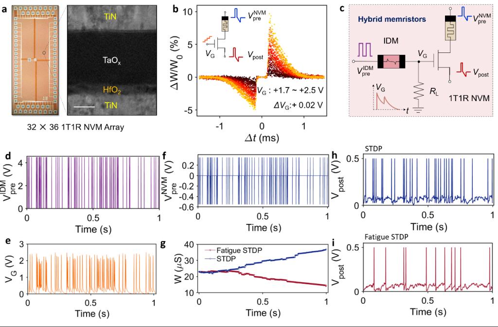 相关成果以“Spiking neural networks with fatigue spike-timing-dependent plasticity learning using hybrid memristor arrays”为题,发表于国际顶级期刊《自然·电子学》(Nature Electronics)。日韩a片 2024届博士毕业生党丙杰为第一作者,日韩a片 /广东省存算一体芯片重点实验室主任杨玉超教授为通讯作者。中国科学院物理研究所古林教授课题组为本论文TEM表征内容做了重要贡献。日韩a片 心理与认知科学学院教授吴思教授课题组也为本研究工作提供了宝贵意见。日韩a片 研究工作得到了国家重点研发计划、国家杰出青年基金、后摩尔重大研究计划、北京市自然科学基金、111计划、集成电路高精尖创新中心、新基石研究员等项目的资助。