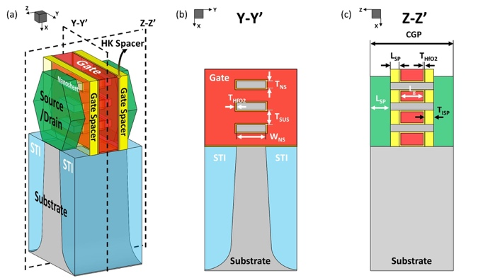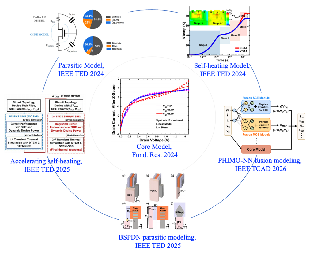 近年来,张立宁助理教授-黄如院士团队针对纳米片围栅(GAA)器件的集约模型已经发表了一系列高水平论文,构建了自主化的PHIMO围栅模型体系。纳米片器件的一个显著特性在于超薄的沟道厚度,极致微缩的沟道会出现显著的量子限域效应,出现能级量子化以及不同于传统特性的台阶状电特性。与此同时,纳米尺寸器件中愈加显著的焦耳热效应显著提升晶体管温度,独特中段结构的寄生效应则导致响应速度减慢,这些高阶效应对器件和电路的可靠性等构成明显影响,需要在电路设计中加以考虑。针对上述问题,团队从器件物理入手,发展了基于物理的核心模型,并围绕核心模型开展了系统性的模型技术攻关。提出了量子限域效应的精准求解策略,发表在由国家自然科学基金委员会主管主办的《Fundamental Research》[2]。针对GAA自热效应独特的热响应动态,提出了基于物理的多阶自热模型,精准捕捉器件的温度响应,发表在微电子器件领域顶刊《IEEE Trans. Electron Devices(TED)》[3]。提出基于保角变换方法的寄生电容模型,实现对中段寄生效应的准确再现,同样发表在《IEEE TED》[4]。提出了电路自热效应加速仿真的技术,通过动态时间演进和功率等效等技术,实现仿真加速3个数量级左右,论文发表在《IEEE TED》[5]。提出了BSPDN特有的寄生效应模型,形成了对前沿新技术的探索并完成对不同技术选项的对比评估,论文发表在《IEEE TED》[6]。团队还针对先进工艺模型复杂化、参数提取困难的挑战,提出了创新性的融合建模的技术PHIMO-NN,通过物理与AI的双轮驱动,实现模型参数的降阶以及基于训练的快速参数化,论文发表在《IEEE Transactions on Computer-Aided Design of Integrated Circuits & Systems》[7]。