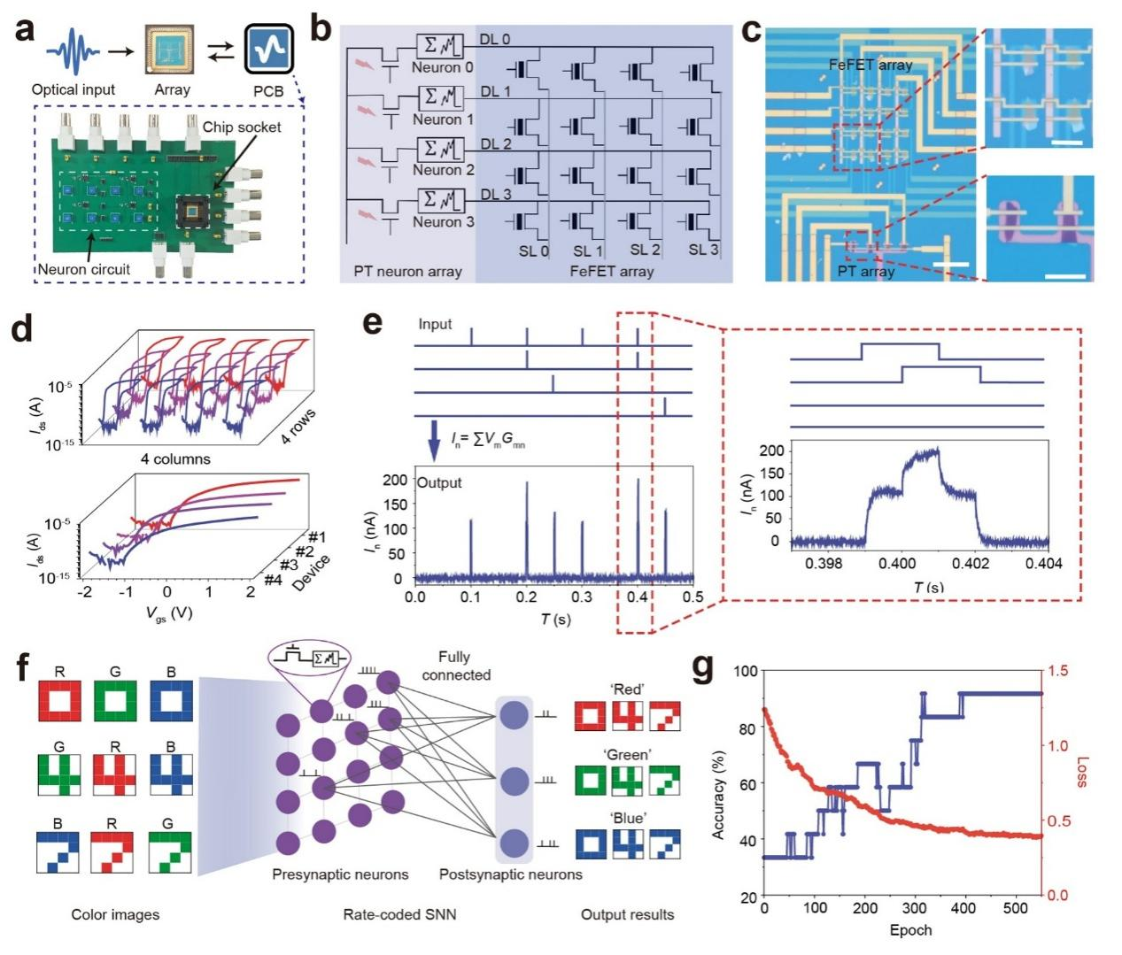 在系统验证层面,研究团队实现了神经元与突触器件的同质集成,将神经元电路与MoS₂器件阵列结合,构建了面向光电SNN的传感器内计算架构。该系统中,光信号由光电晶体管(PT)阵列感知,经神经元编码为脉冲后输入铁电突触(FeFET)阵列完成乘累加(MAC)运算,实现端到端神经形态处理。基于该平台的RGB颜色分类任务仿真准确率达到91.7%,验证了其在视觉感知计算中的应用潜力。