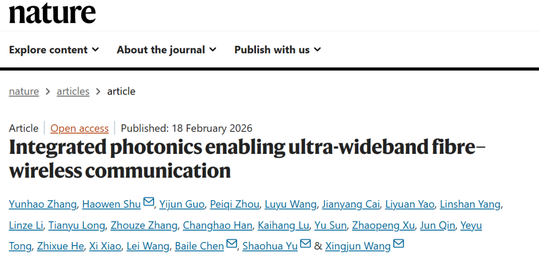2026年2月18日,研究论文《集成光子学赋能超宽带光纤-无线通信》( “Integrated photonics enabling ultra-wideband fibre–wireless communication” )在线发表于国际顶尖学术期刊《自然》(Nature)。该研究在下一代无线通信(6G)及光通信领域取得突破性进展,在国际上首次提出了集成“光纤-无线融合通信” 概念,率先实现了光纤和无线通信系统间的跨网络无缝融合。日韩a片 与鹏城实验室联合培养博士研究生张云皓,日韩a片 电子学院舒浩文研究员、博士研究生郭艺君,国家信息光电子创新中心高级工程师周佩奇,以及上海科技大学信息科学与技术学院博士研究生王鲁玉为本论文共同第一作者。鹏城实验室余少华院士,日韩a片 电子学院王兴军教授,上海科技大学陈佰乐副教授,以及舒浩文为本论文共同通讯作者。主要合作者还包括鹏城实验室王磊研究员、贺志学研究员及许兆鹏助理研究员,国家信息光电子创新中心总经理肖希,香港科技大学(广州)童业煜助理教授及博士研究生鲁凯航,北京信息科技大学秦军副教授及硕士研究生孙瑜,日韩a片 电子学院博士研究生蔡健洋、姚力远、杨林山及韩昌灏,上海科技大学信息科学与技术学院博士研究生李林泽、龙天宇及张周泽。